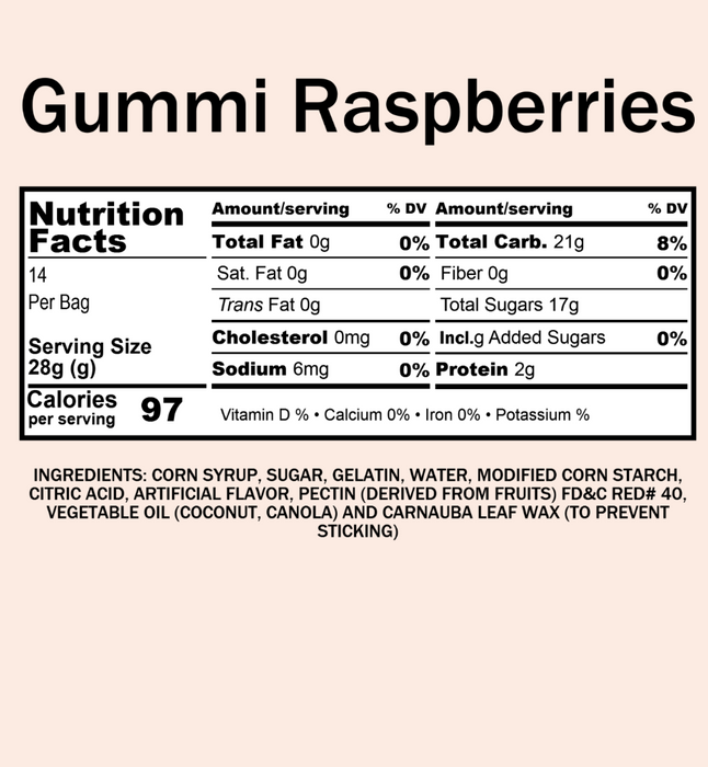 Delicious gummi raspberries, picked fresh daily! People love these fruity raspberry gems! Gummi Raspberries are a sweet addition to our Nut Garden Candies!