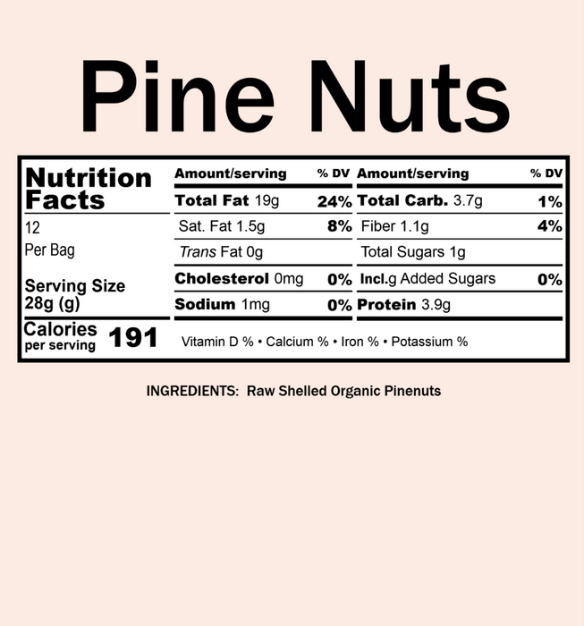You're gonna love these pine nuts.  Pine nut are tiny treasure from pinecones and are nature's little powerhouses for top flavor and nutrition.  These ivory-colored gems have a sweet and buttery taste. Pine nuts can be used in anything from from pesto to salads.